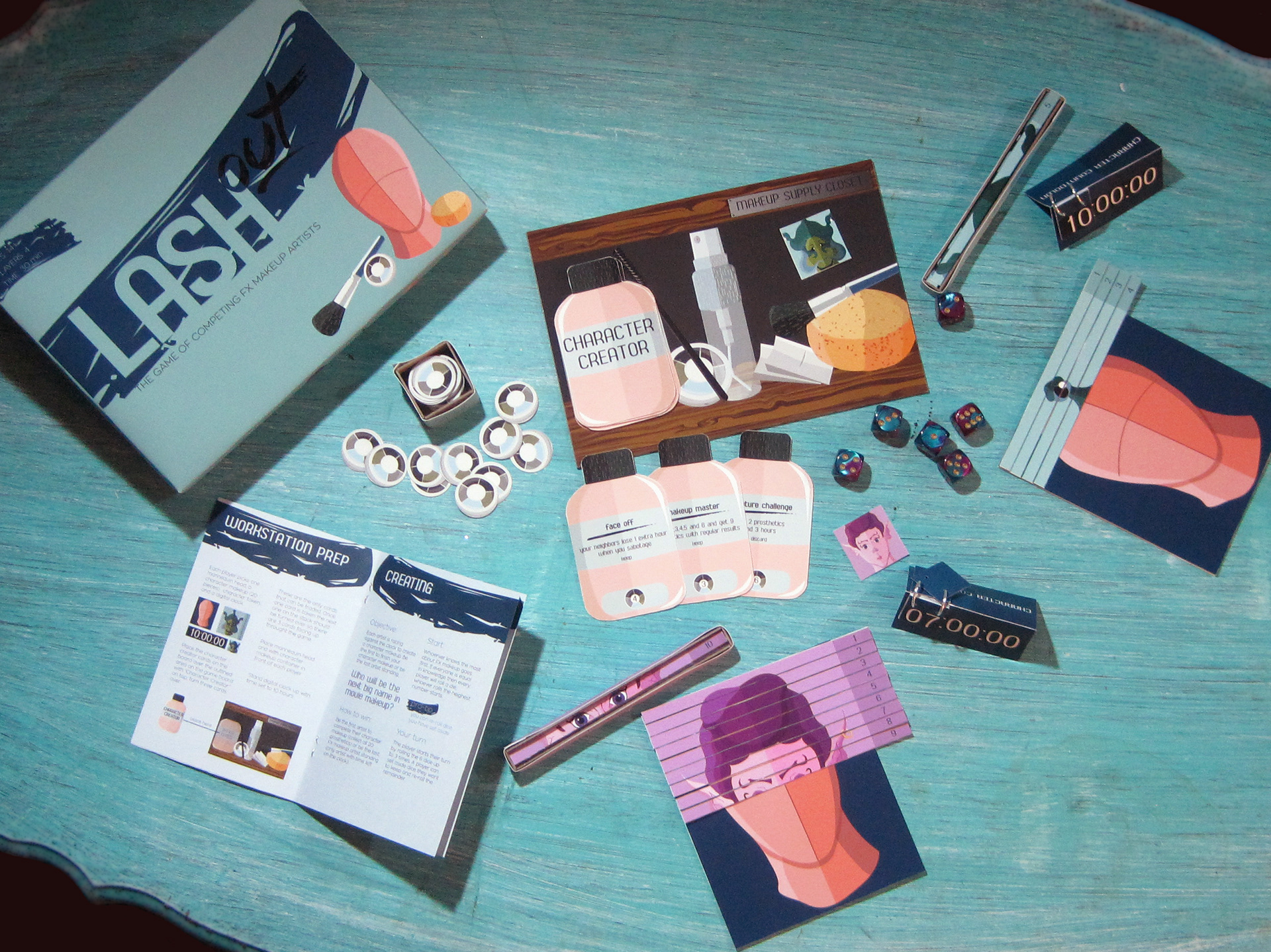 "Lashout" is an FX Makeup themed board game that sheds light on the cut-throat world of the makeup behind movie magic. Grab a model, collect supplies, and put your skills to the test. Lights. Camera. Create.